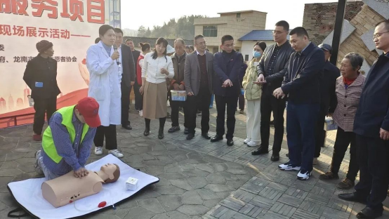 接着,“小药箱”项目在龙南市临塘乡大屋村进行了现场展示,现场会由基础医学院党委副书记刘志春支持,首先学校学工处处长王建发对“小药箱”项目进行了讲解。随后,引导村民参与义诊活动,并重点进行了心肺复苏、海姆立克法的现场教学,在场的村民和与会代表纷纷模仿动作,参与其中,有的村民跃跃欲试,上前演示刚学习的内容,活动收到了良好的效果。最后与会领导给脱贫户发放了家庭小药箱。