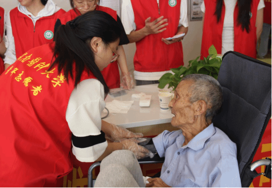 活动现场气氛温馨而有序。针对老年群体常见病、多发病,同学们用通俗易懂的语言,深入浅出地讲解了高血压、糖尿病、心脑血管疾病、骨质疏松等疾病的预防、日常管理、合理用药及科学饮食知识。流动检测组同步为老人测血压、血糖,详细记录每位老人的数据,并根据测量结果给予个性化的健康建议。在互动环节同学们与老人共唱《没有共产党就没有新中国》等红色歌曲,在歌声中传承红色基因,厚植家国情怀。