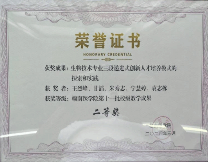 通过“法技育人工程”系统实施,支部在教学改革与人才培养方面取得显著成效。近五年承担省级教改项目3项、校级课程思政项目7项,获校级教学成果奖1项。指导学生获省级以上大创项目10余项,在全国大学生医学创新大赛暨“一带一路”国际竞赛等高水平竞赛中屡获佳绩。2024届生物技术专业考研录取率达44.9%,创历史新高,其中95.6%过线学生成功录取,充分彰显育人工作扎实成效。