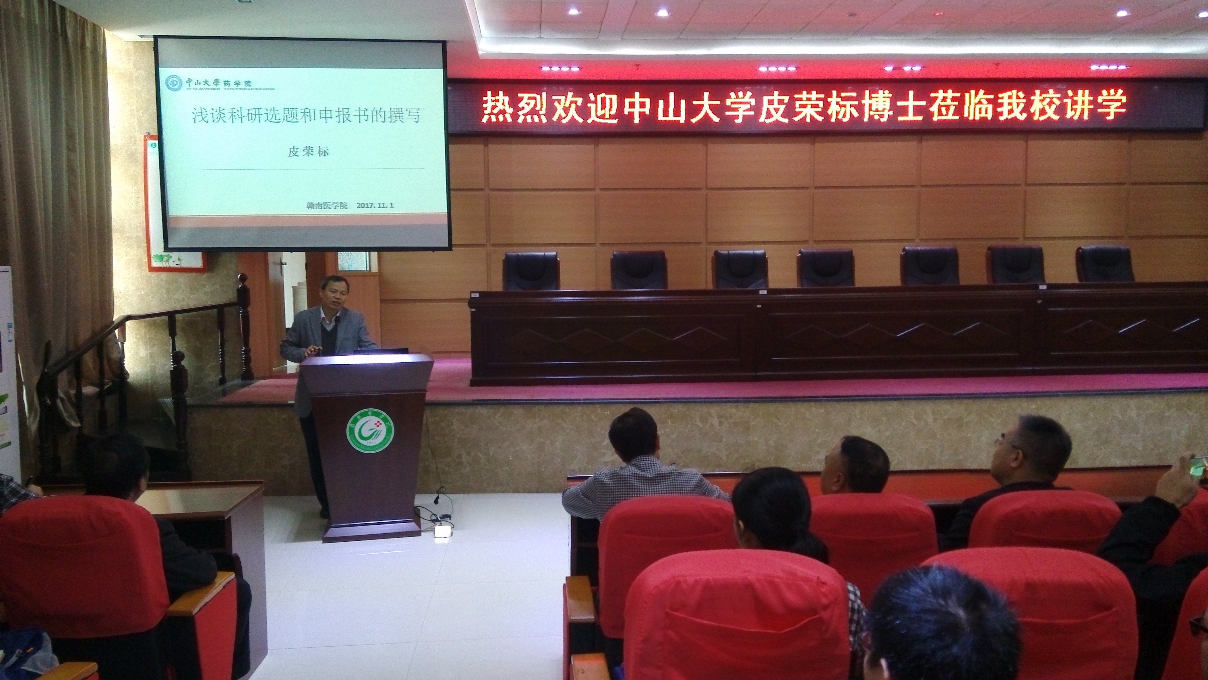 11月1日,中山大学皮荣标博士应邀到校讲学,作了题为“浅谈科研选题和申报书的撰写”的专题学术讲座,就如何进行科研选题、撰写申报书、准备申报等内容进行了详细阐述,并与教师、学生进行了热烈讨论。同时还与学校人事处就柔性人才引进、团队建设等事宜进行了协商沟通,并围绕科研合作、学术交流等内容与部分教师代表进行了座谈。