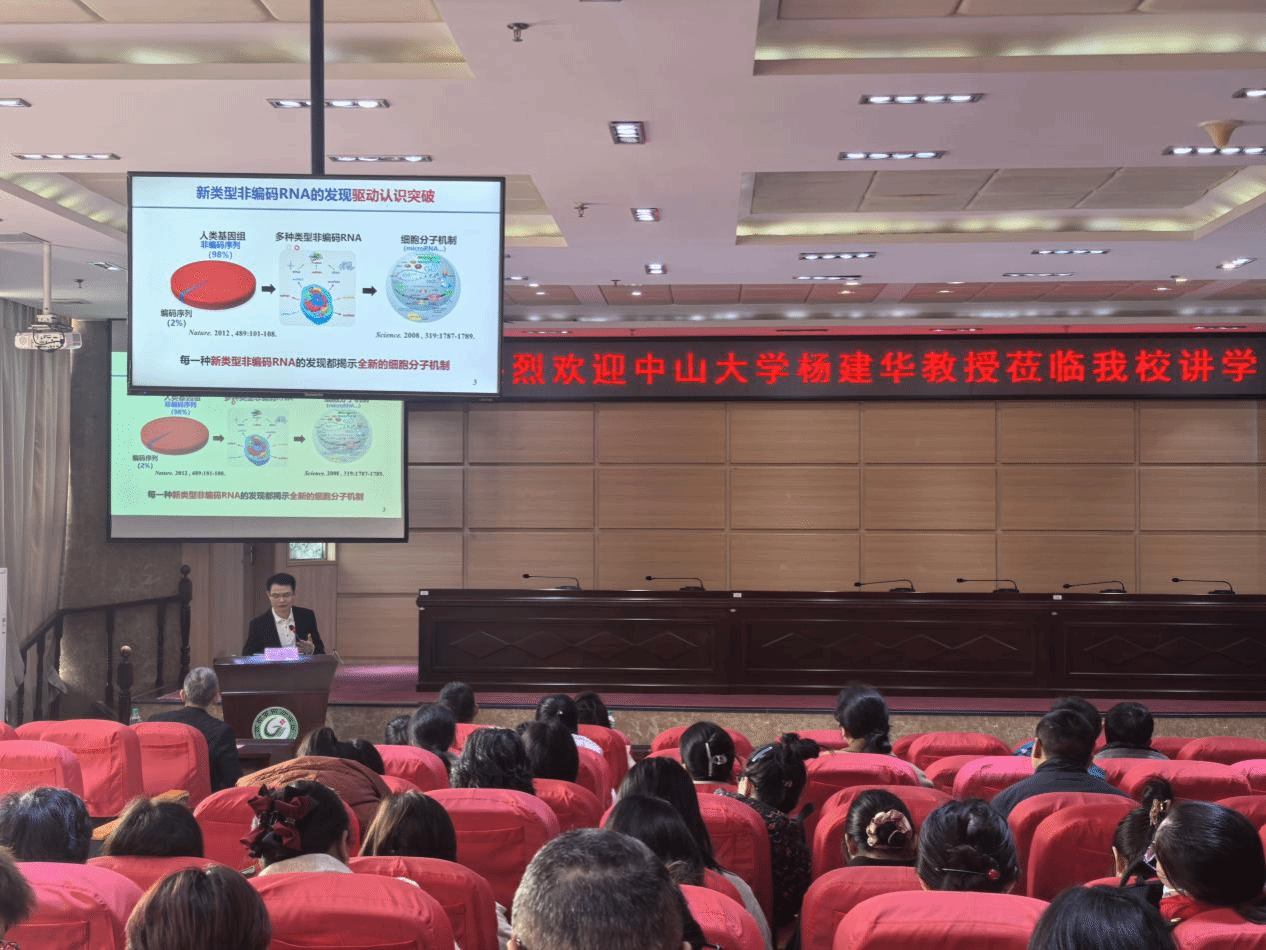 本次讲座中,杨建华教授以“RNA 组学揭示新型结构 RNA 及其调控功能与潜在应用”为主题,系统阐述了其团队构建的原创RNA组学技术体系,详细介绍了以bktRNA为代表的新型结构RNA的发现过程,深入阐明了这类新型RNA的关键调控机制,为在场师生展现了该领域的前沿研究动态。
